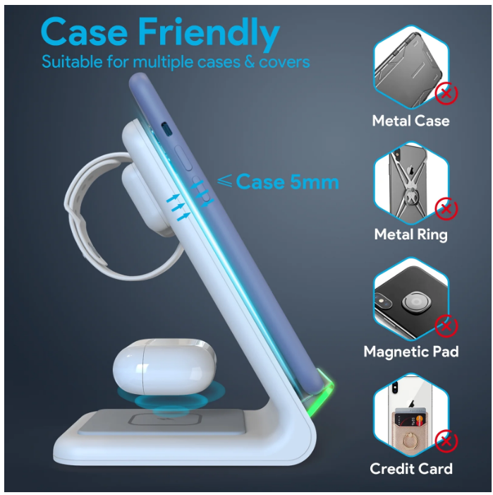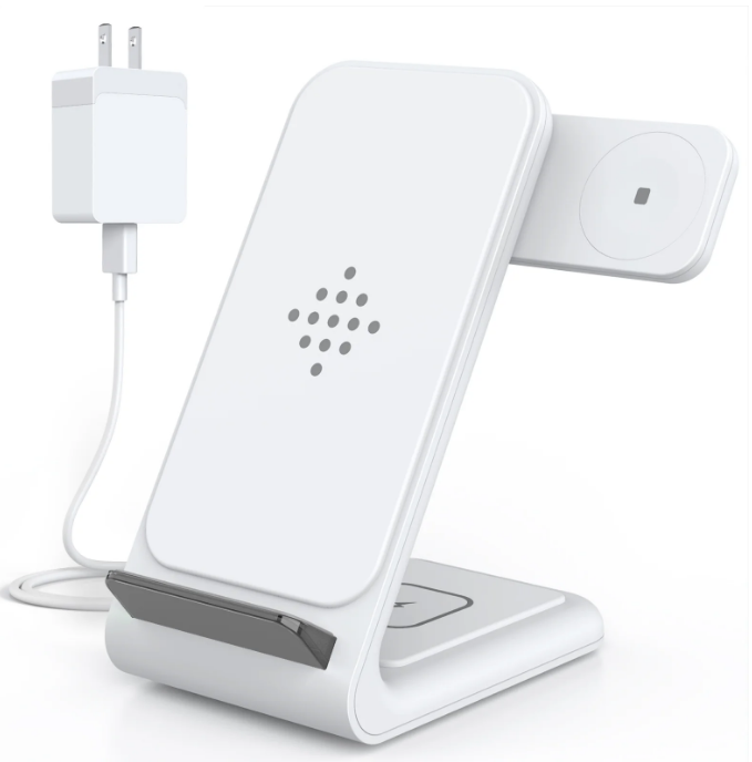 Streamline your charging setup with this efficient 3-in-1 Wireless Charging Station, tailored for Apple devices. It powers your iPhone, Apple Watch, and AirPods all at once, eliminating clutter and freeing up outlets. The upright stand lets you view your phone hands-free while charging, and the included adapter guarantees fast, dependable power. Its sleek white design complements any workspace or bedside table. Ideal for Apple users seeking a practical, stylish, and compact charging solution for home, office, or on the go.