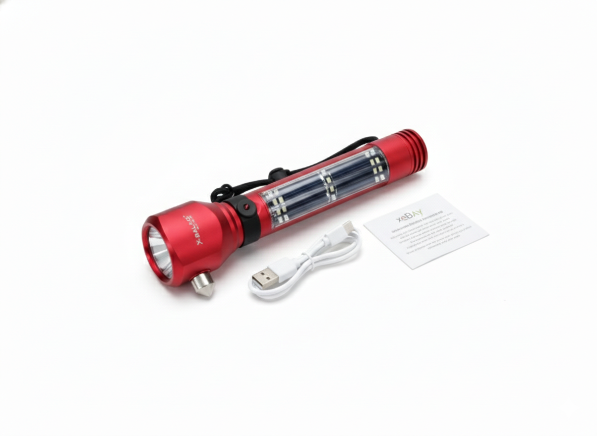 Multi-Functional Flashlight with Seat Belt Cutter, Solar Charging, Alarm, Window Breaker, etc